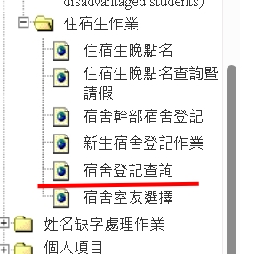 校務系統路徑:校務系統→學務資訊模組→住宿生作業→宿舍登記查詢