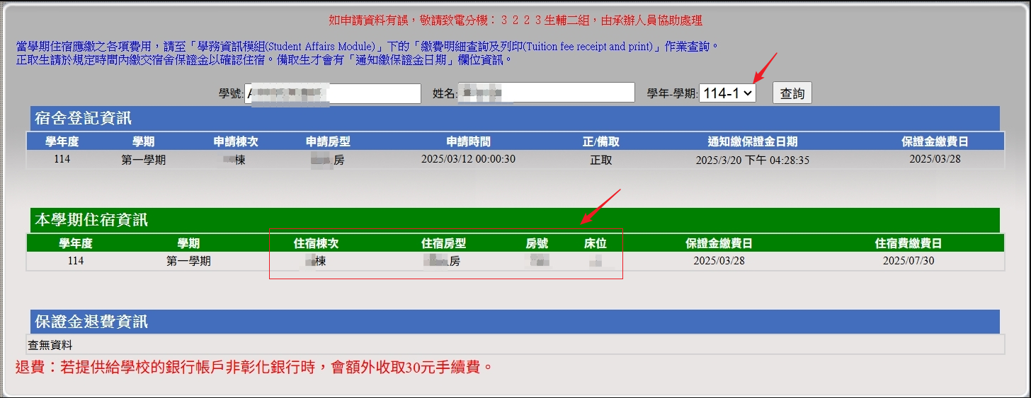 若想要查詢113-2保證金退款相關明細及進度,學年-學期請選擇113-2後查詢(B1、B2、H棟適用),MN棟請洽詢L棟管理室。
